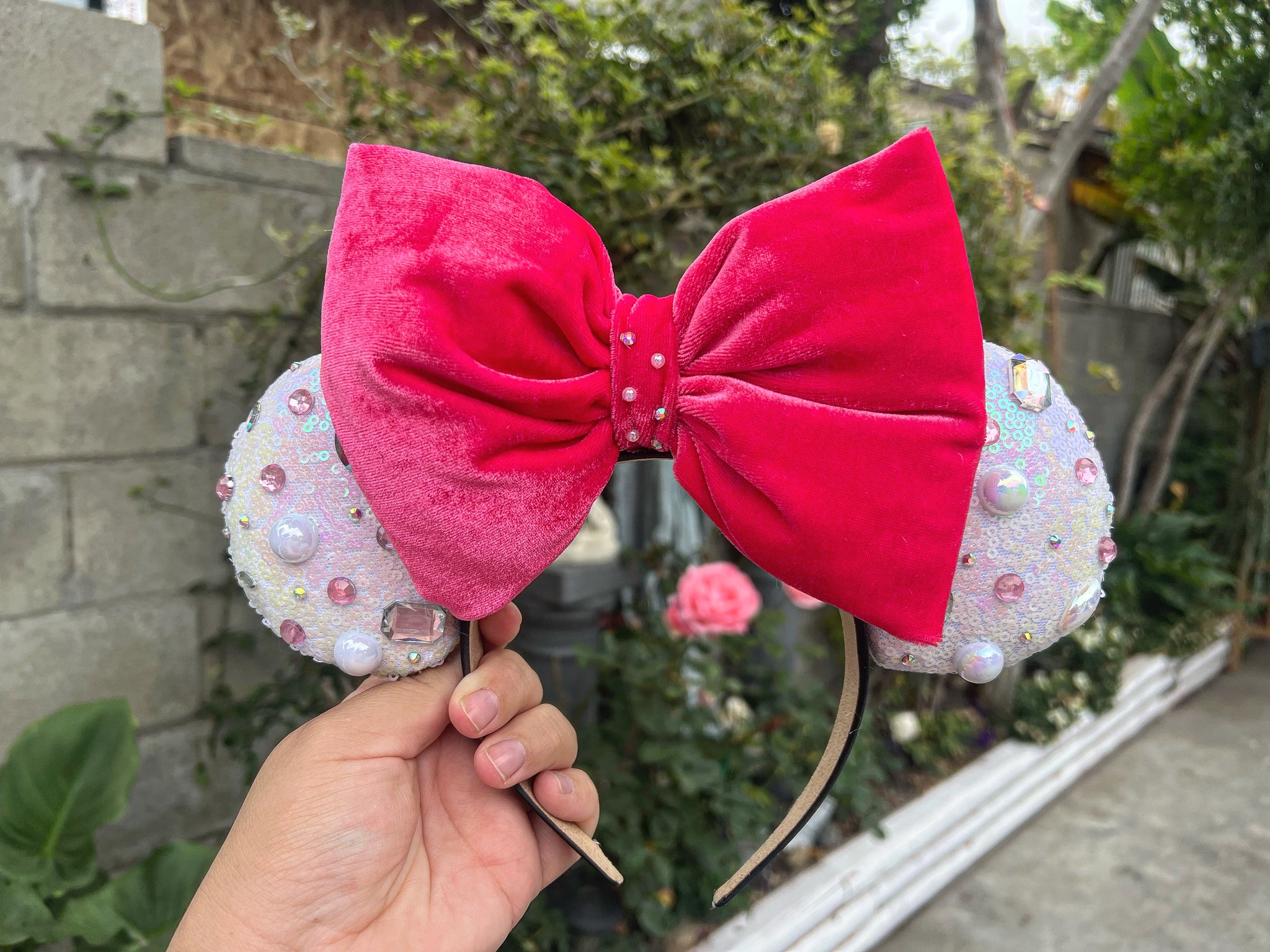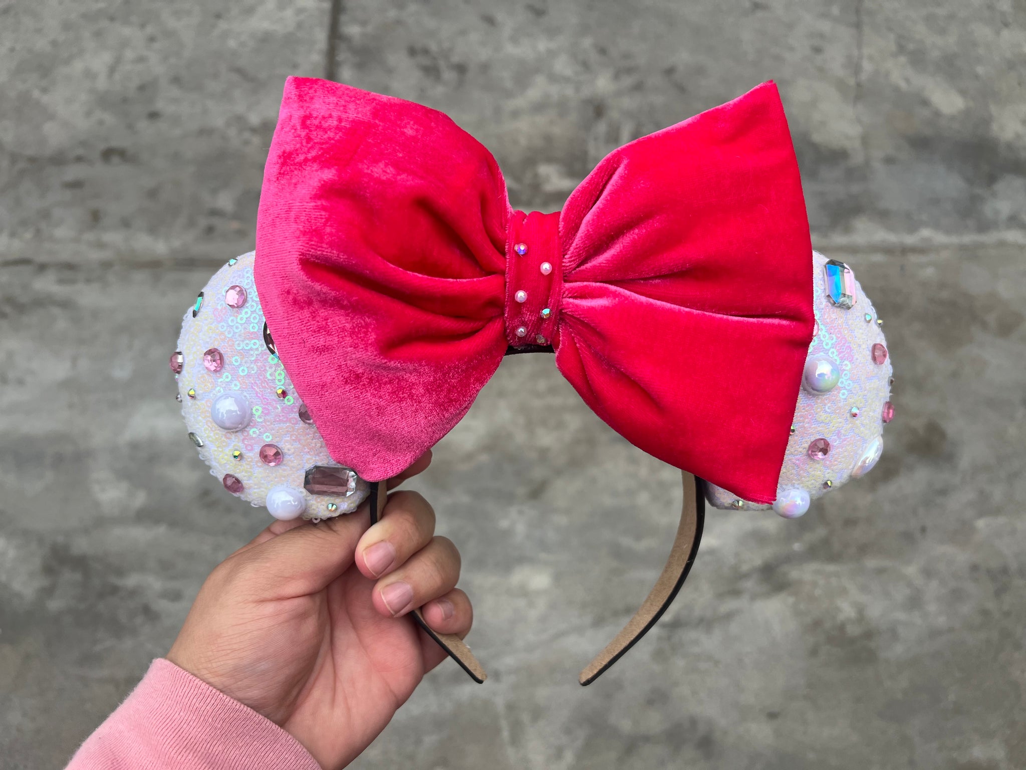 White sequin Ears with a velvet bow color of your choice and a mix of pearls and diamonds on the ears.